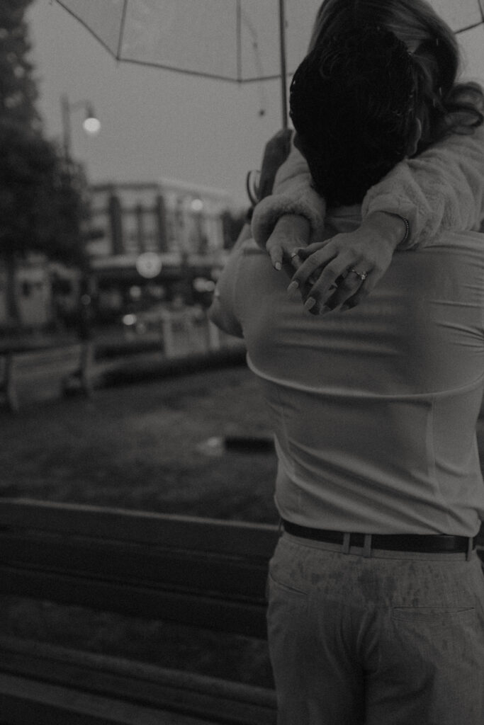 It sounds simple, but it transformed the session. The umbrella let the rain stay part of the story instead of something we had to hide from. Raindrops caught the light. Lauren’s veil-like movement. Josh pulling her in just a little closer.